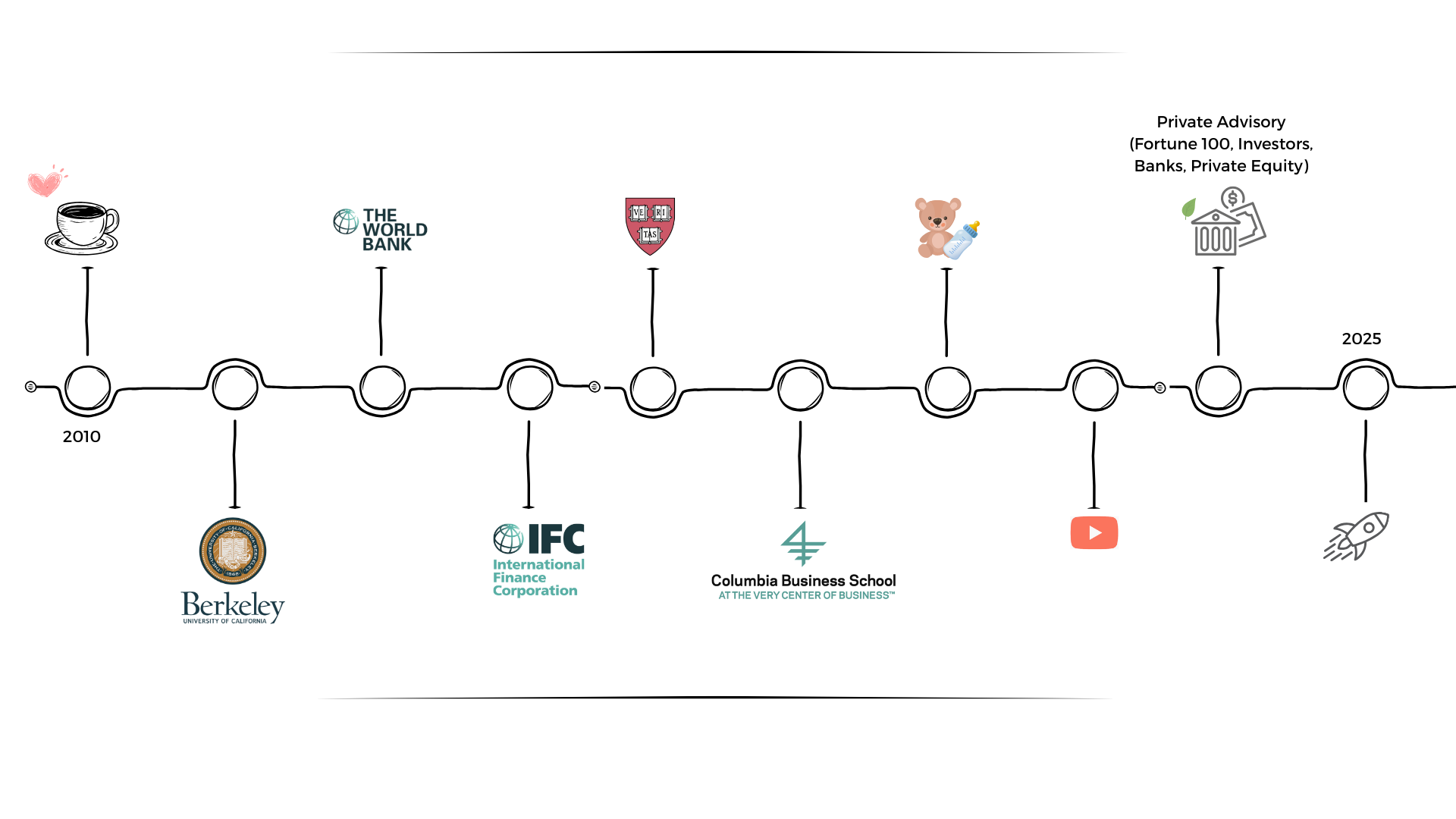 I have a background in Economics and International Development at UC Berkeley, a Master's in Management and Business Economics from Harvard University, and an MBA from Columbia Business School.